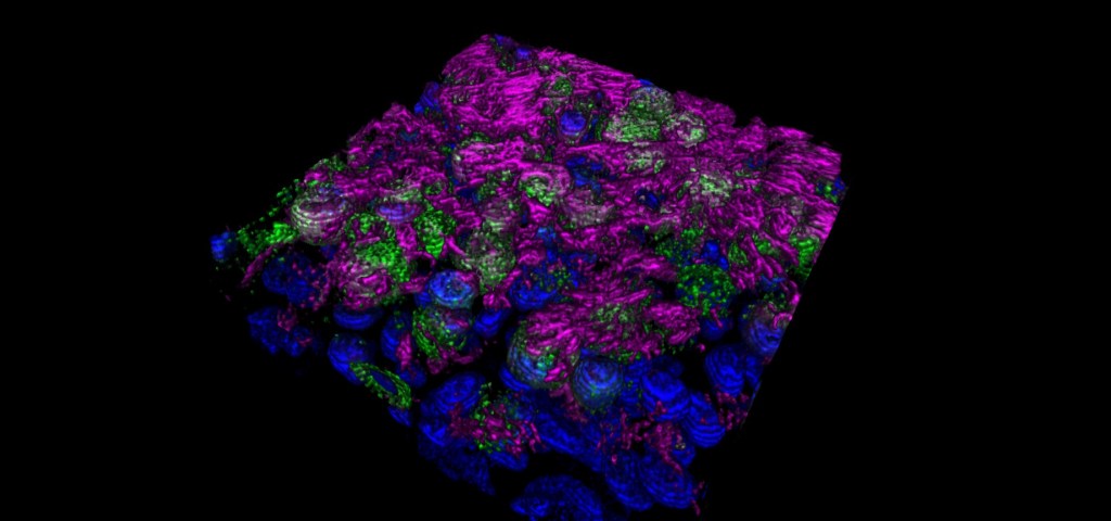 Images (clockwise from left): 1. Lab photo taken July 2021 2. VeroE6 TMPRSS2 cells infected with SARS-CoV-2 (source: Dr. Eddy Anaya). Green is spike blue is nucleus 3. Filamentous influenza budding from a cell (source: Dr. Andrew Pekosz).